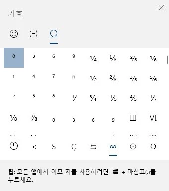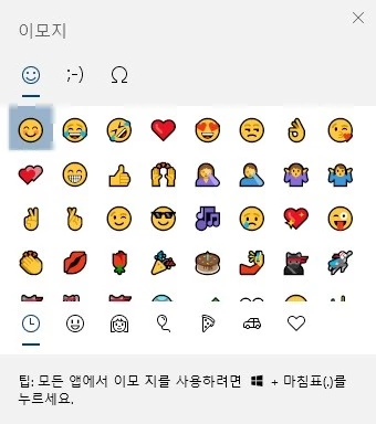 윈도우10의 최신 버전을 사용하면 키보드 왼쪽 아래 Ctrl 키와 Alt 키 사이의 윈도우 키를 누른 상태에서 마침표 . 키를 누르면 아래 그림처럼 하트를 비롯한 윈도우10이 지원하는 이모지와 특수문자를 입력할 수 있습니다.