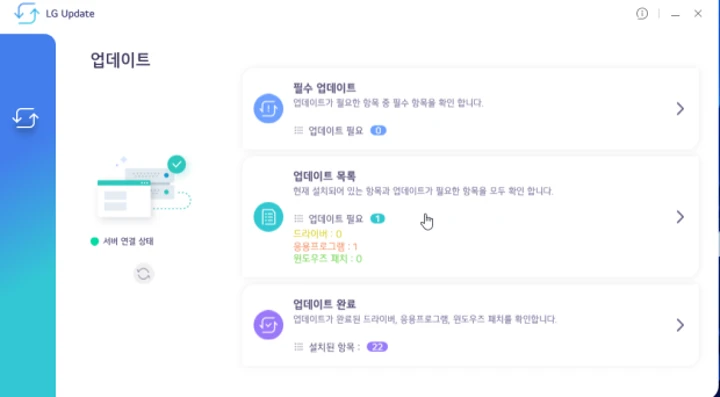 - 설치가 완료되면 노트북을 재부팅하고, LG Update 프로그램을 실행하여 필요한 Lg smart assistant 프로그램을 설치합니다.
